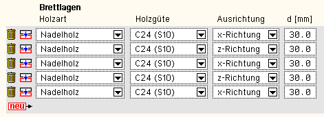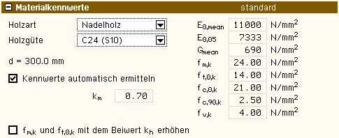 Holz und Stahl sind mit sinnvollen Werten vorbelegt, können