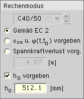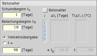 | Der Zeitpunkt t zur Berechnung der Betondruckfestigkeit beim Aufbringen der Belastung wird bei den querschnittsabhängigen Kriechparametern eingegeben. |