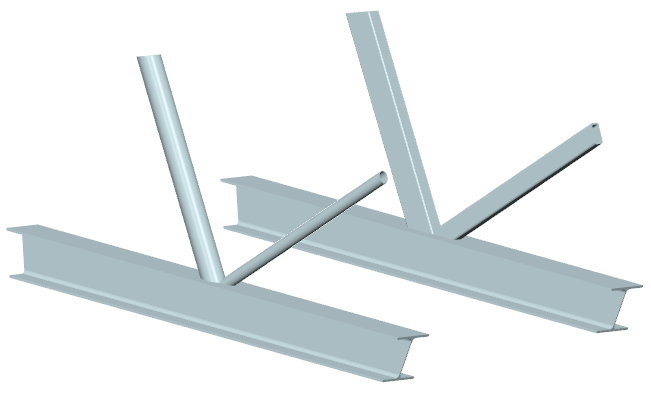 ... zwei Streben mit (unterschiedlichen) Rechteck- oder Kreisrohrquerschnitten werden unter verschiedenen Winkeln an einen Gurt mit I-Profil angeschlossen |
