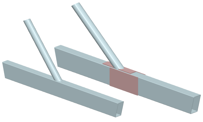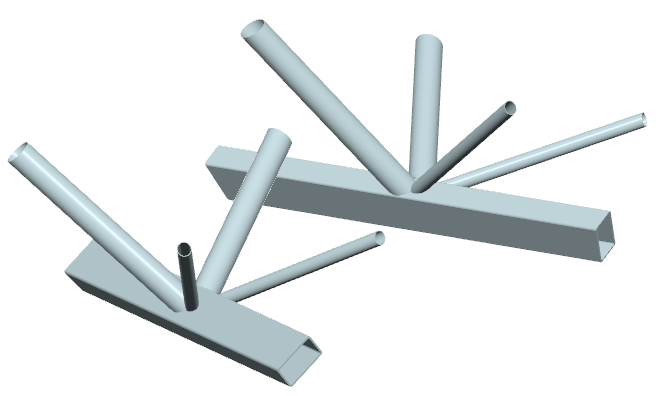 ... zwei Streben mit Kreisrohrquerschnitten werden räumlich rechtwinklig an einen Gurt mit Rechteckrohrquerschnitt angeschlossen |