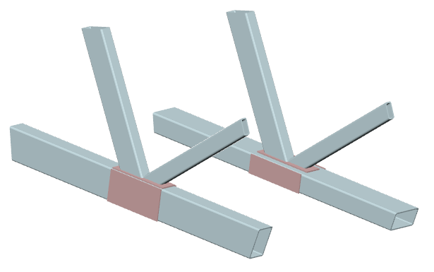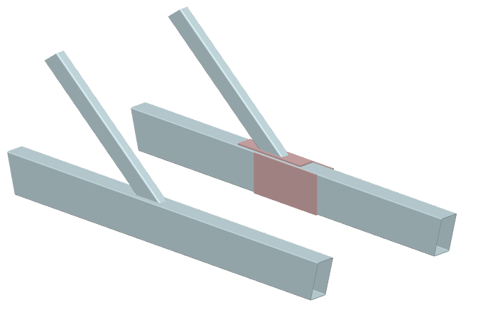 ... zwei durchlaufende Streben mit (unterschiedlichem) Rechteckrohrquerschnitt werden rechtwinklig an einen Gurt mit Rechteckrohrquerschnitt angeschlossen |