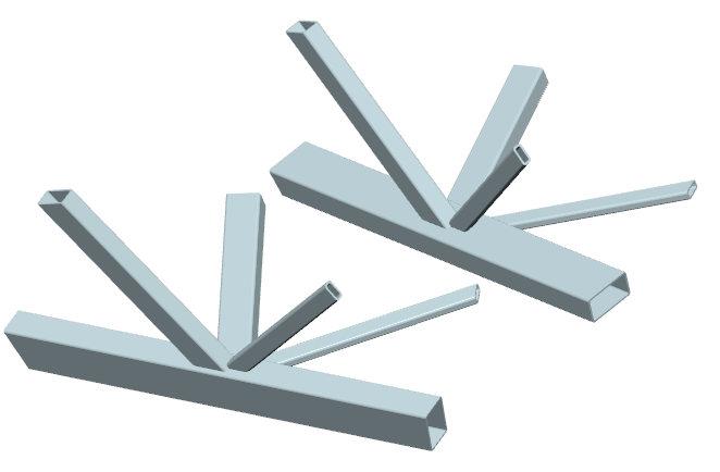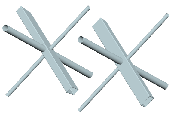 ... zwei durchlaufende Streben mit (verschiedenem u. ggf. gedrehtem) Rechteckrohrquerschnitt werden rechtwinklig an einen