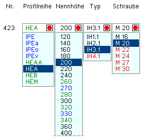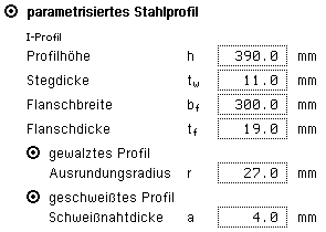 die Parameter des Stützenprofils ohne