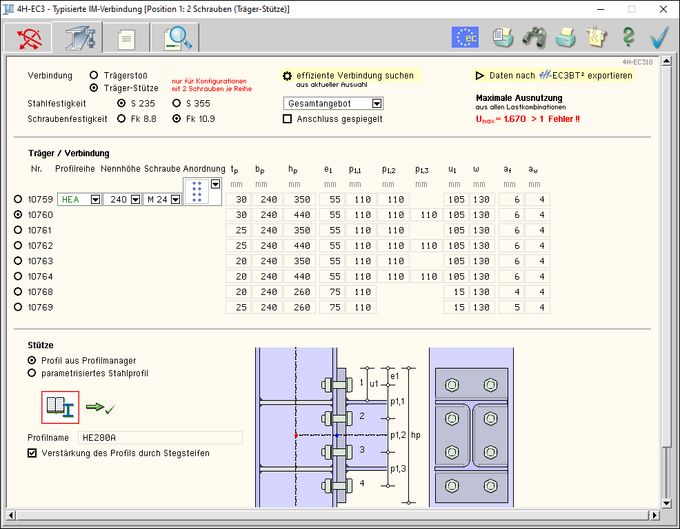 Das Programm 4H-EC3IM,Typisierter IM-Anschluss, berechnet momenten- und normalkrafttragfähige Trägerstöße