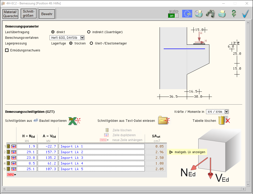 -EC2KB, Register Bemessungsparameter und Schnittgrößen - Lastkonsole