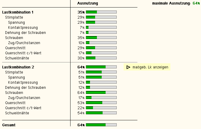 die Ergebnisse (Ausnutzungen) lastfallweise und detailliert