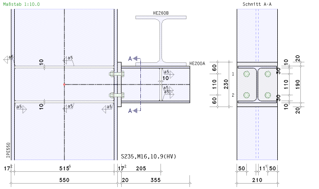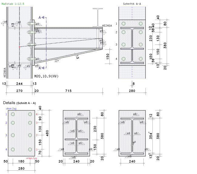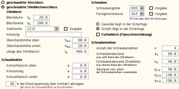die Spannungen in Stirnblech, Schweißnähten und Schrauben zu bestimmen. |