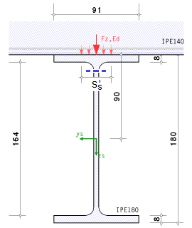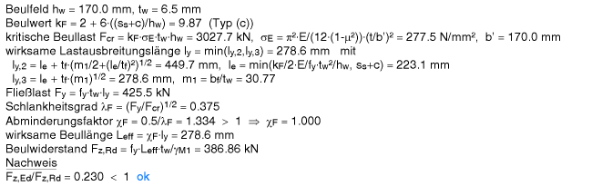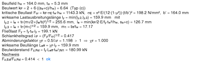| Im Beispiel wurden Quersteifen angeordnet, die die volle Querlast aufnehmen können, sodass der Steg nur für die geringe Querlast Fz,Ed = 18.9 kN nachzuweisen ist. Berechnungsweg s.o. |