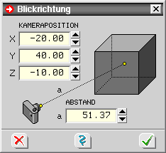 | Der nebenstehend dargestellte Button gehört zur Buttongruppe Ansicht und ist nur im 3D-Modus aktivierbar. Wird er angeklickt, kann die Blickrichtung (Kameraposition) numerisch eingestellt werden. |  |  |  |  |