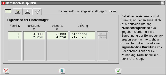 | Detailnachweispunkte sind Punkte, an denen zusätzlich zum normalen Umfang Zwischenergebnisse ausgegeben werden, um die Berechnung der Bemessungsergebnisse nachvollziehbar zu machen. |