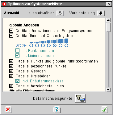 | In dem Auswahlfenster können alle Elemente der Systemdruckliste (Grafiken und Tabellen) an- bzw. abgeschaltet werden. |