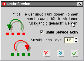 | Unter Verwendung der Voreinstellung operiert der undo-Mechanismus mit 10 undo-Levels und einem redo- Level. Dies bedeutet, dass die letzten 10 Änderungen am aktuellen Datenzustand sukzessive rückgängig gemacht werden können. Wird die undo-Funktion einmal zu oft aufgerufen, kann mit der redo-Funktion (Wiederherstellen) auch dies bereinigt werden.