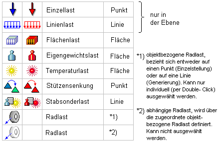 | In der ersten Spalte ist das Symbol in normaler Form und in der zweiten Spalte im ausgewählten Zustand dargestellt. Die letzte Spalte gibt den zugeordneten, belasteten Objekttyp an. |