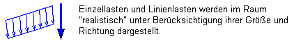 | Der sich hieraus ergebende Skalierungsfaktor wird auf alle Lastordinaten angewandt, jedoch wird eine Mindestgröße bei der Darstellung nicht unterschritten, um die Auswählbarkeit kleiner Einzel- und Linienlasten per Mausklick zu gewährleisten.