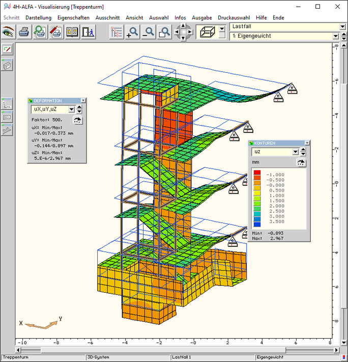 mit der Konturflächendarstellung der Durchbiegung senkrecht zur jeweiligen Positionsebene unterlegt. |  |