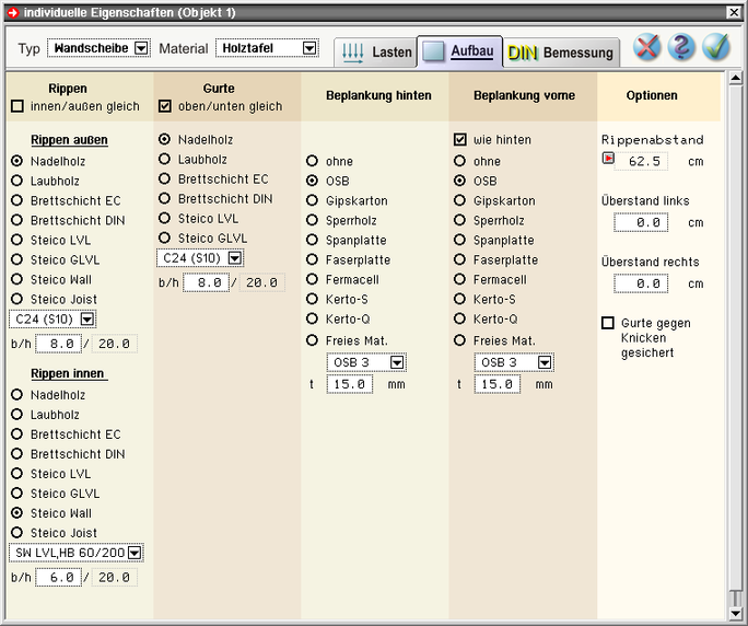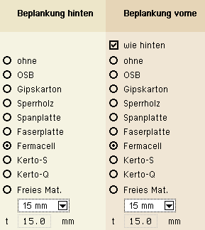 | Die vordere und hintere Beplankung und ihre jeweilige Stärke werden über die