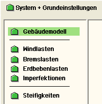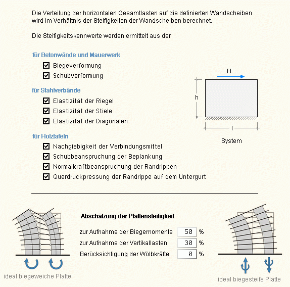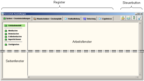 | Die Hauptsteuerung erfolgt über die Register System + Grundeinstellungen, Wandscheiben + Deckenplatte, Kraftaufteilung, Belastung, und Ergebnisse. |