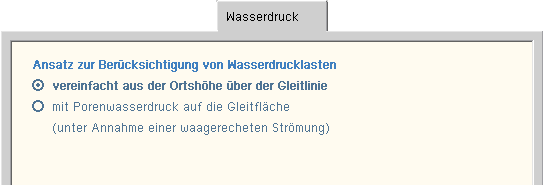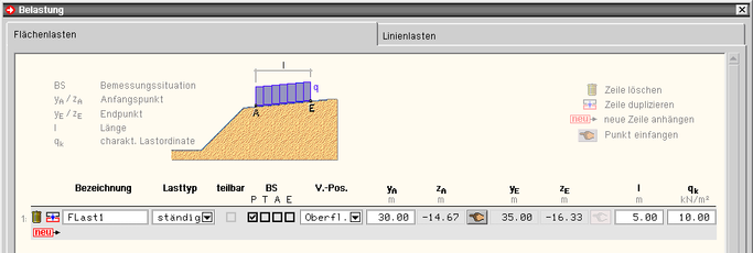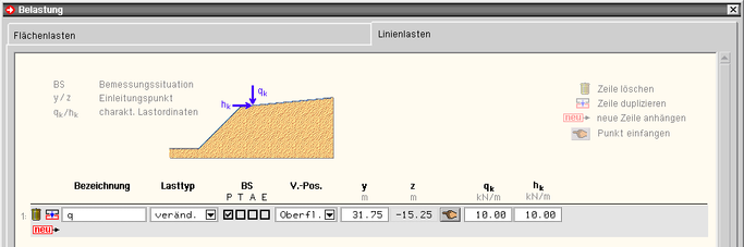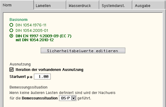 Sollten keine äußeren Lasten (s. Belastung) definiert sein, ist hier die Bemessungssituation vorzugeben, für die der Nachweis nur infolge der Bodensituation zu führen ist. |
