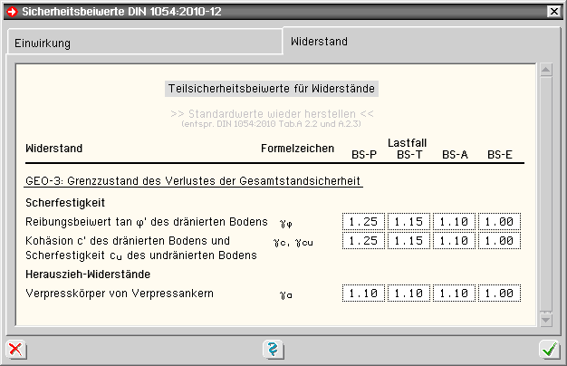 die Teilsicherheitsbeiwerte der gewählten Norm